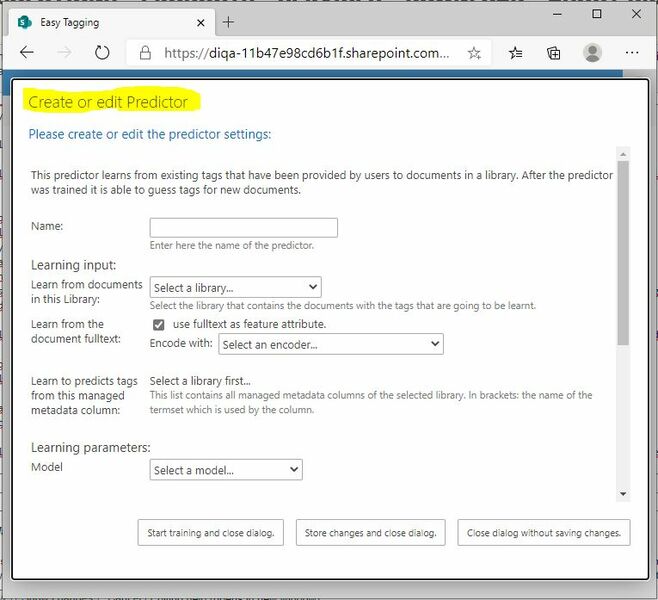 1. After you have created a connection to the IDAS Evaluation service you can setup a predictor which learns to tag documents from your examples. 2. In the (now empty) list of predictors click on the link: "Click to create new item". 3. In the selection dialog, select the "Learn Tags" predictor. 4. The configuration form for the new "Learn Tags" predictor opens. 5. Enter the name of the predictor, e.g. "Document types" 6. In the field "Learn from documents in this library": select the library that contains your documents. 7. In the field "Encode with": select the entry "Glove English subset 100k words". 8. In the field "Learn to predict tags from this managed metadata column": select the "document types" column that you created in the earlier steps 9. In the field "model": select "Simple CNN model" 10. Keep the default values of the subsequent fields. 11. Click on "Start training" to initiate the training process. 12. You can inspect the progress of the training process in the status bar of the predictor.