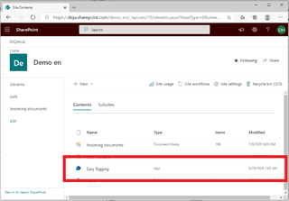 1. Open the site contents again where you should find the newly installed Easy Tagging App 2. Click on the App and grant it the requested permissions. 3. The configuration page of the app opens in a new tab.