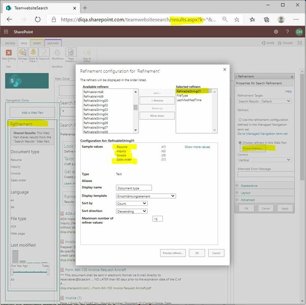 current | 19:23, 29 September 2020 | 949 × 944 (120 KB) | WikiSysop (talk | contribs) | 1. Open the search center 2. Open the search results page (named "results.aspx") 3. Click on "Edit page" 4. In the page edit view: open the property settings of the Refinement webpart 5. Click on the button "Choose refiners" 6. In the "refinement... |