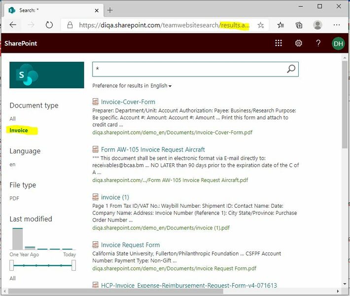 Revision as of 19:31, 29 September 2020 by WikiSysop (talk | contribs) (1. Open the search center 2. Enter "*" as search string and submit the query 3. Inspect the refiner values: they should include your document types 4. Click on a refiner value, like "invoice", in order to restrict your search results to contain only...)